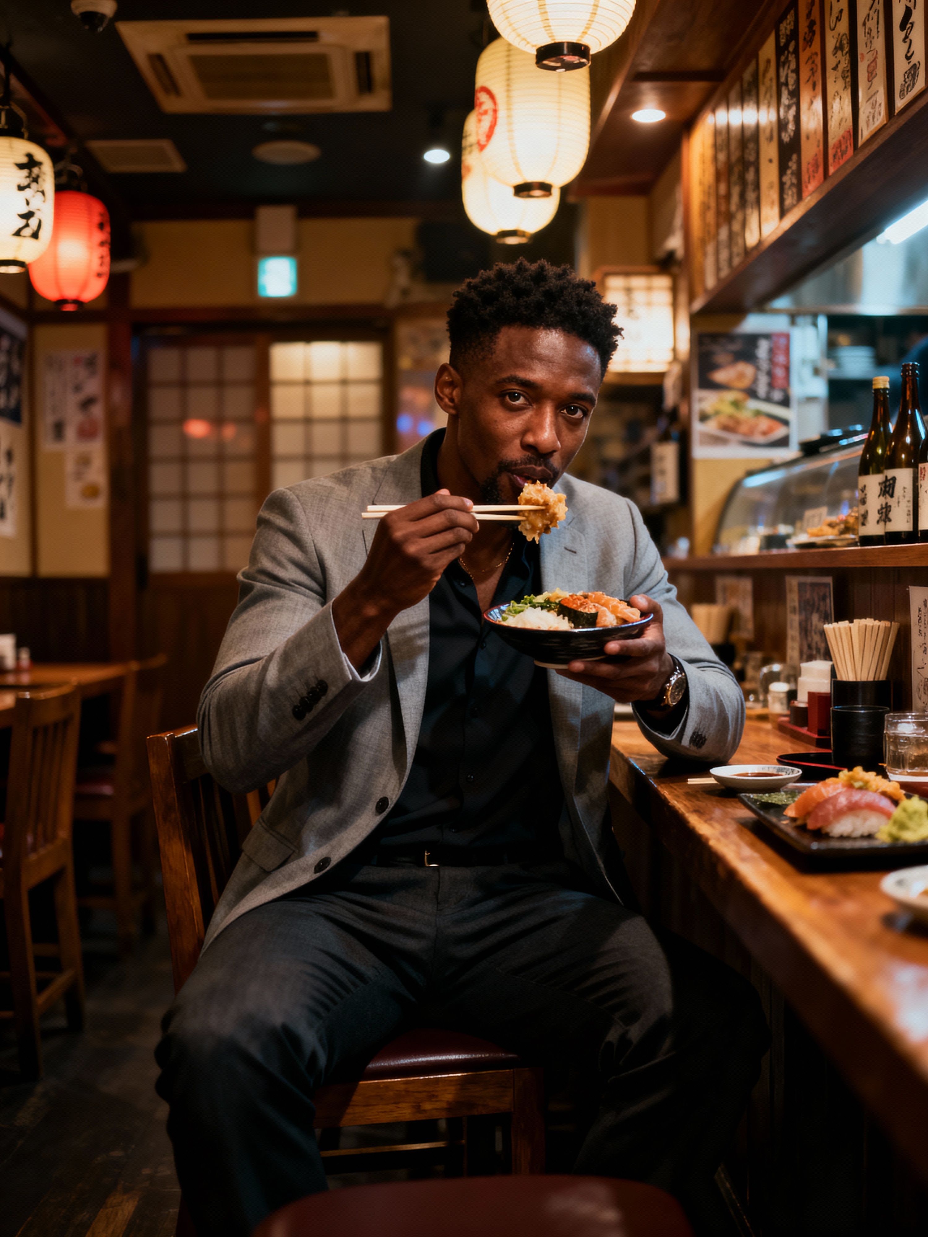 model at a Tokyo izakaya restaurant, wearing relaxed business casual outfit, enjoying Japanese cuisine
