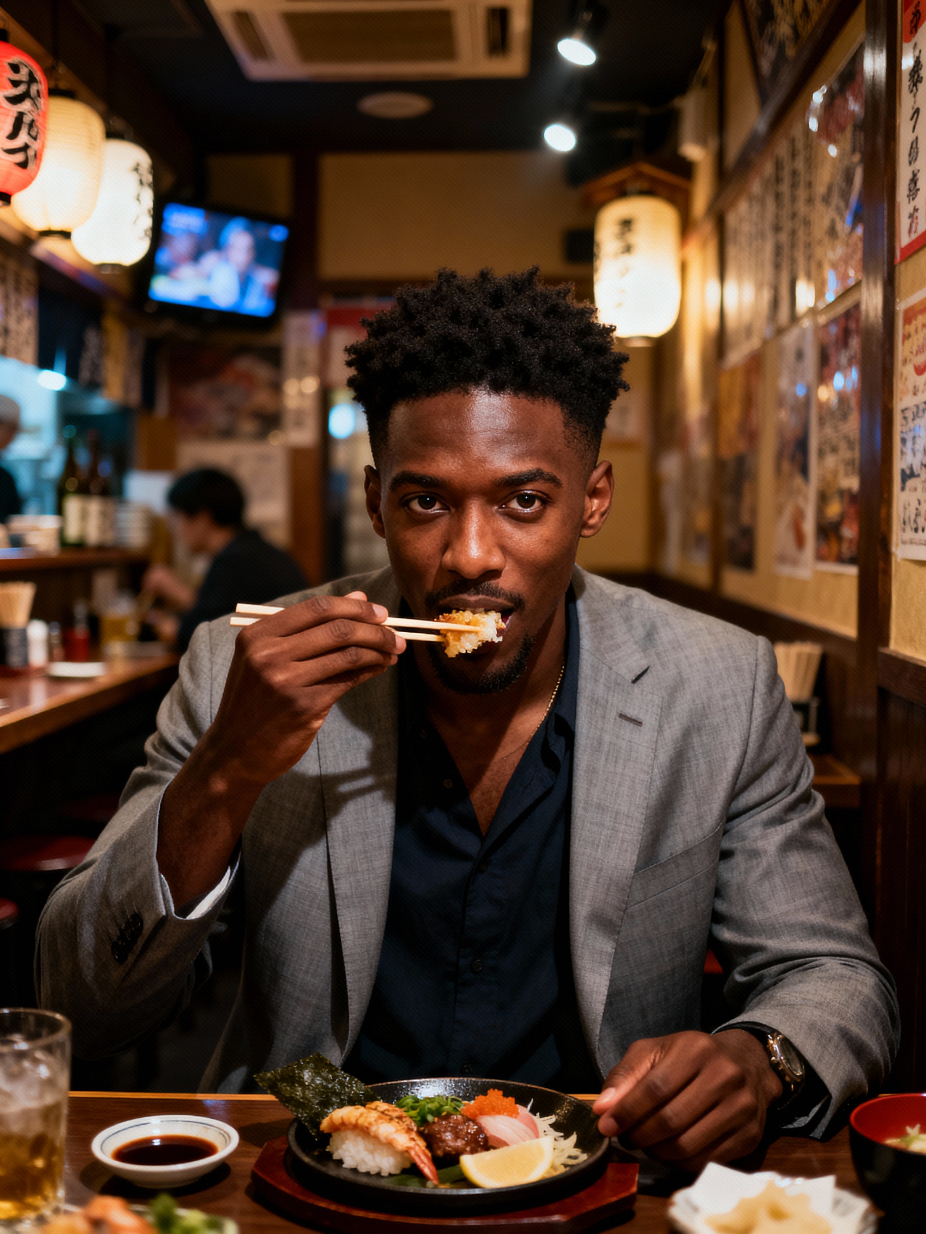 model at a Tokyo izakaya restaurant, wearing relaxed business casual outfit, enjoying Japanese cuisine