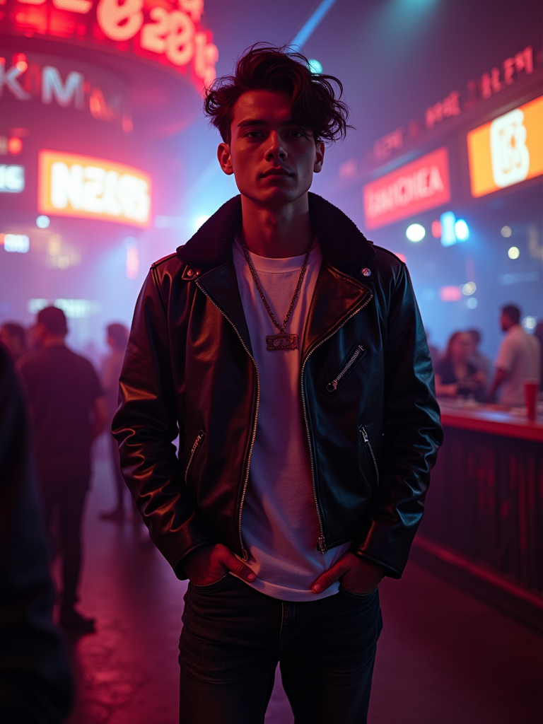 model at a trendy nightclub in Las Vegas. at night. the model wears a stylish and edgy outfit, such as a leather jacket and dark jeans, capturing the high-energy nightlife.