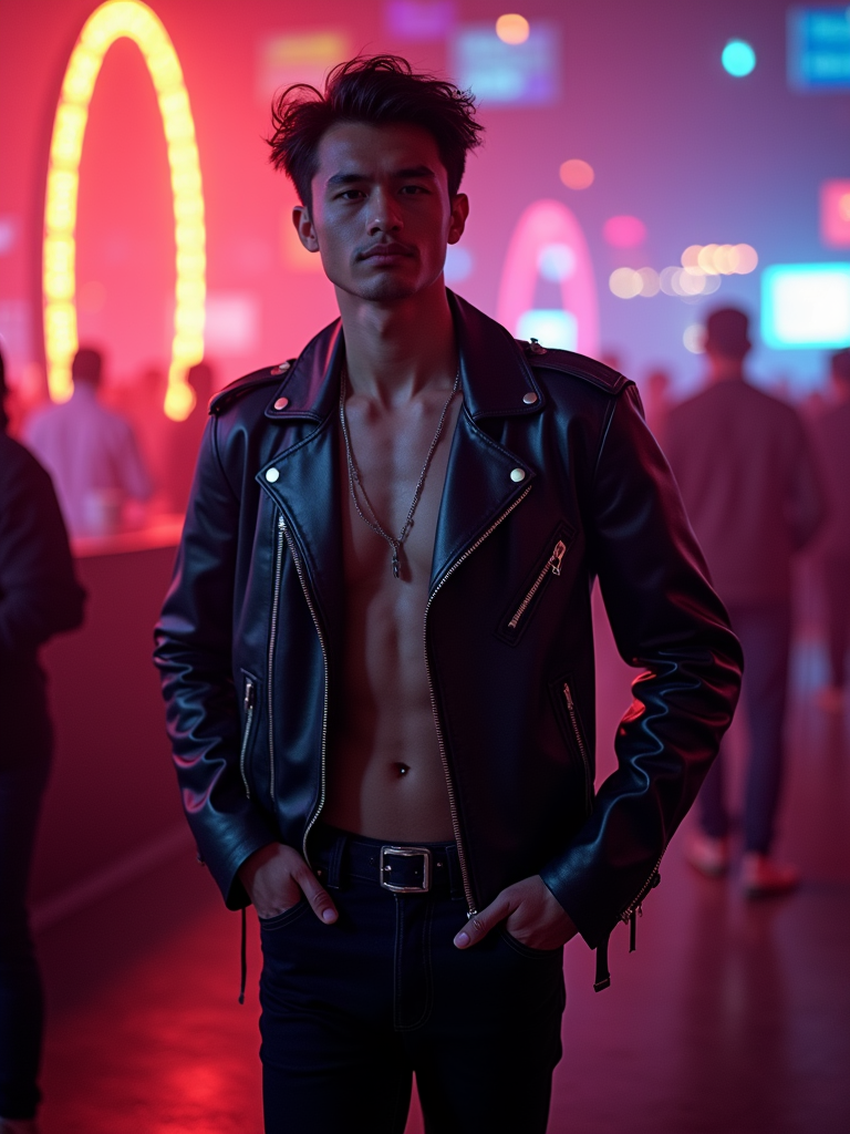 model at a trendy nightclub in Las Vegas. at night. the model wears a stylish and edgy outfit, such as a leather jacket and dark jeans, capturing the high-energy nightlife.