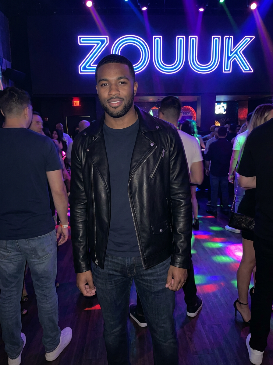 model at a trendy nightclub in Las Vegas. neon says "ZOUK". at night. the model wears a stylish and edgy outfit, such as a leather jacket and dark jeans.