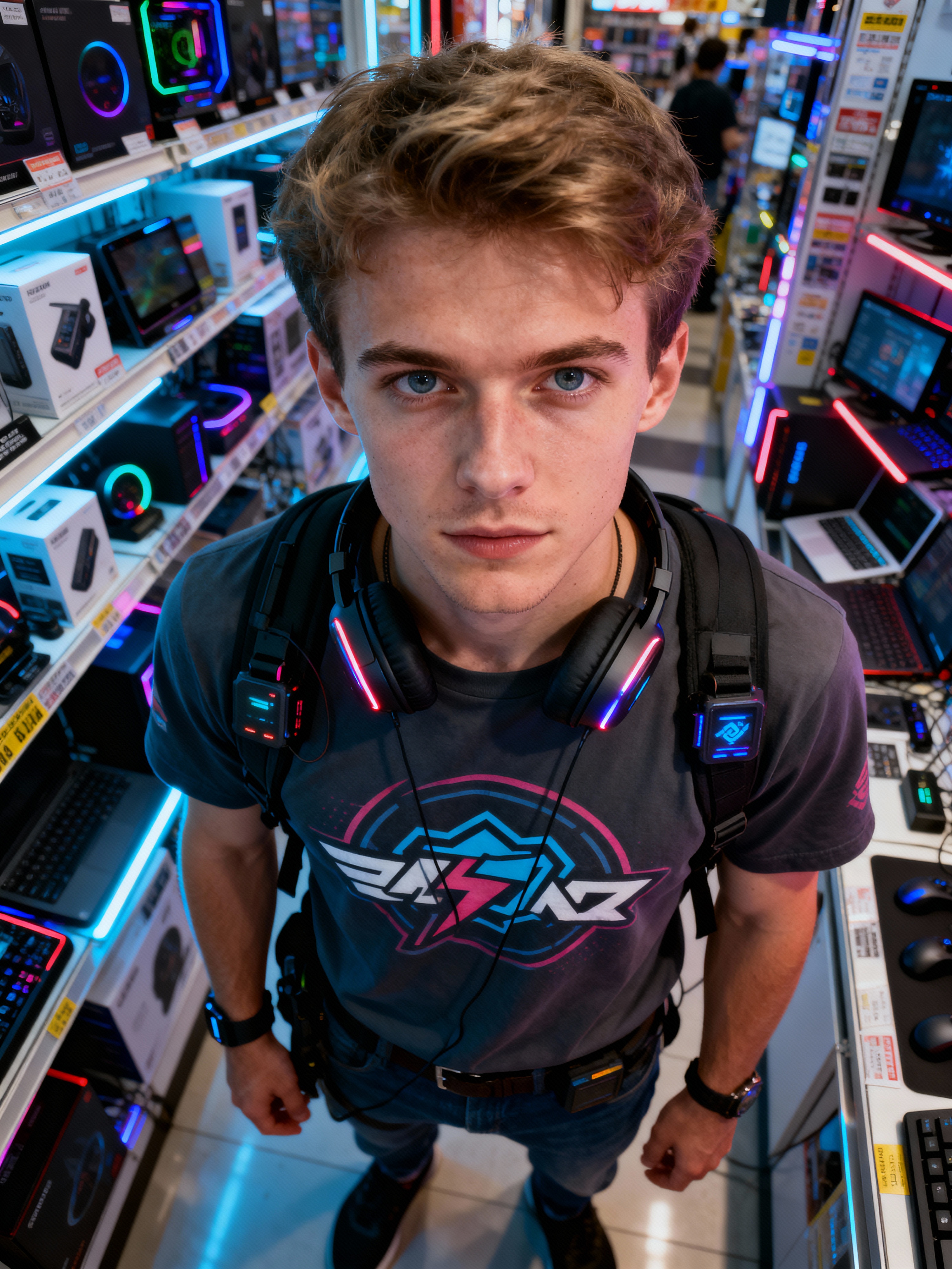 model at Akihabara electric town, wearing casual gaming t-shirt with tech accessories, surrounded by electronics