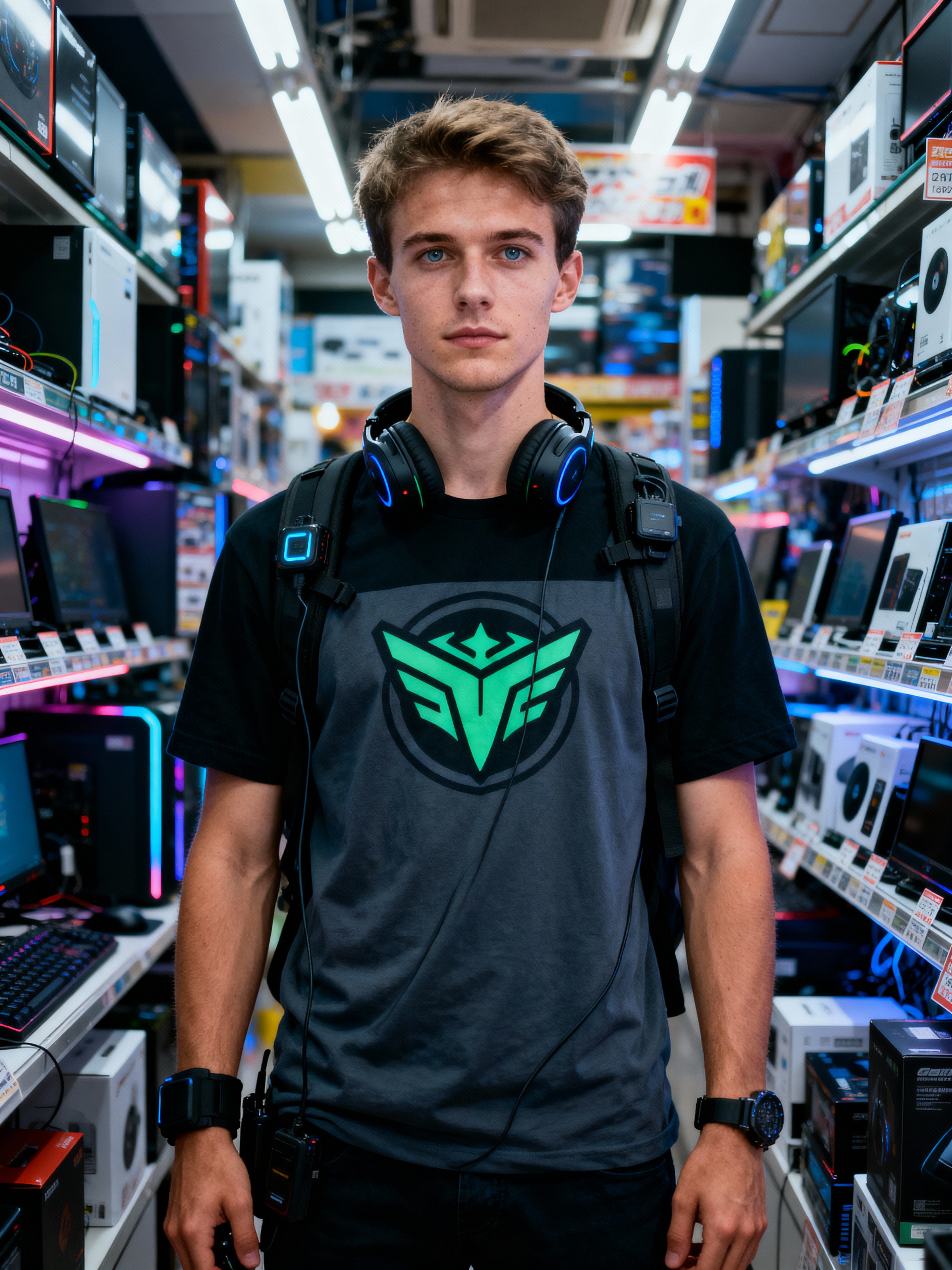 model at Akihabara electric town, wearing casual gaming t-shirt with tech accessories, surrounded by electronics