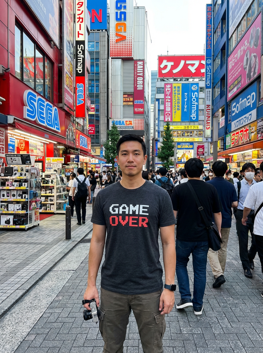 model at Akihabara electric town, wearing casual gaming t-shirt with tech accessories, surrounded by electronics