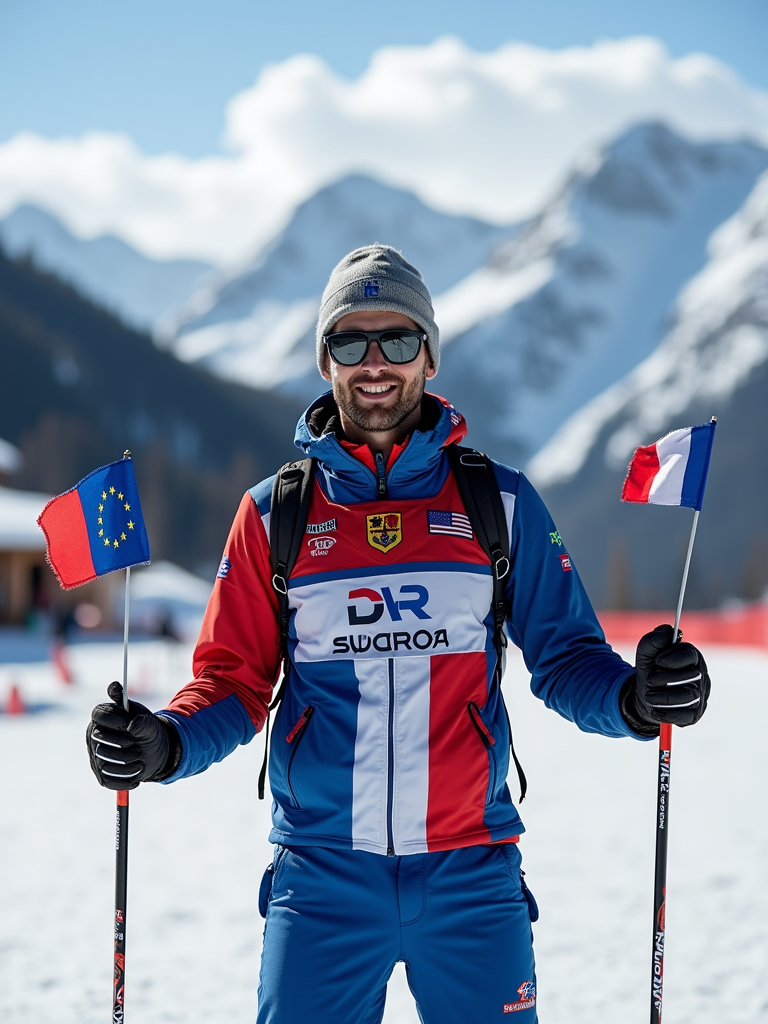 model at an Alpine ski resort, wearing a European-themed ski outfit with flag patches, holding ski poles and a small European flag, majestic snow-capped mountains stretching behind