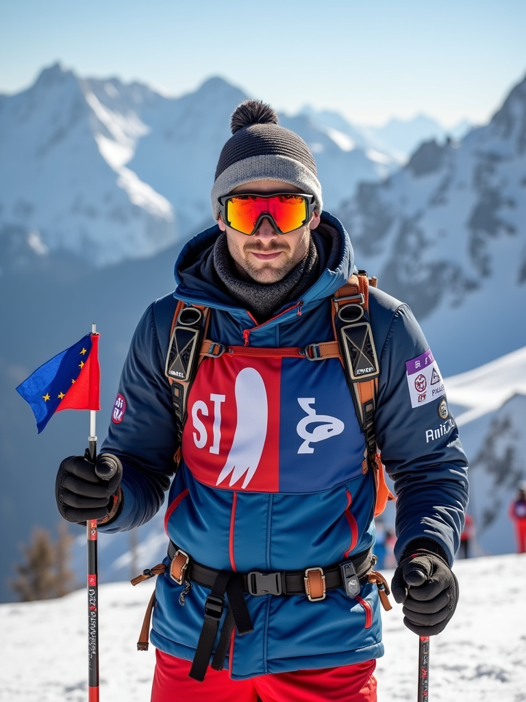 model at an Alpine ski resort, wearing a European-themed ski outfit with flag patches, holding ski poles and a small European flag, majestic snow-capped mountains stretching behind