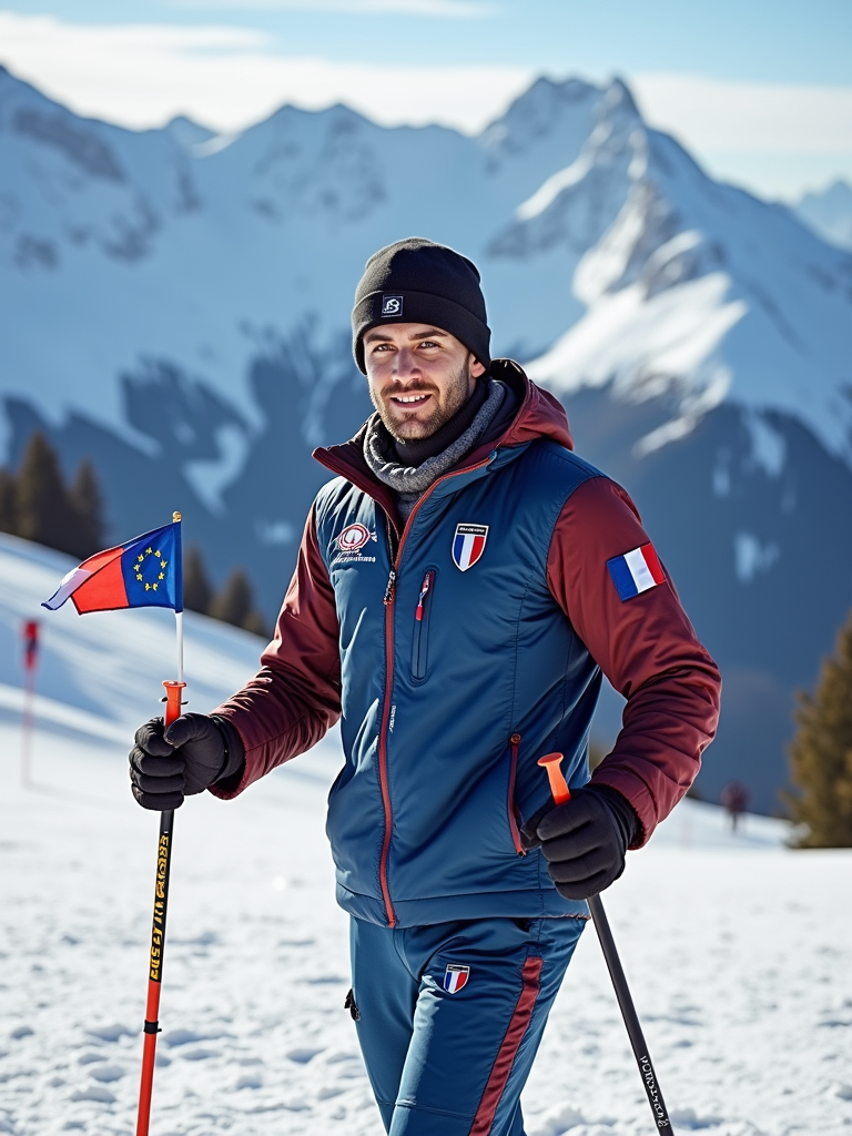 model at an Alpine ski resort, wearing a European-themed ski outfit with flag patches, holding ski poles and a small European flag, majestic snow-capped mountains stretching behind