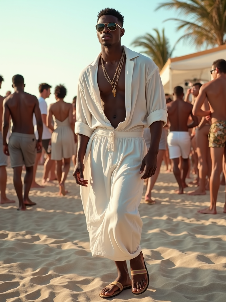 model at an exclusive beach party, wearing white linen ensemble with leather sandals, DJ booth and dancing crowd visible