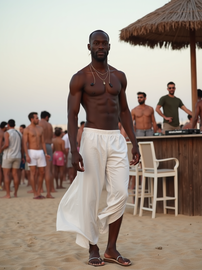 model at an exclusive beach party, wearing white linen ensemble with leather sandals, DJ booth and dancing crowd visible