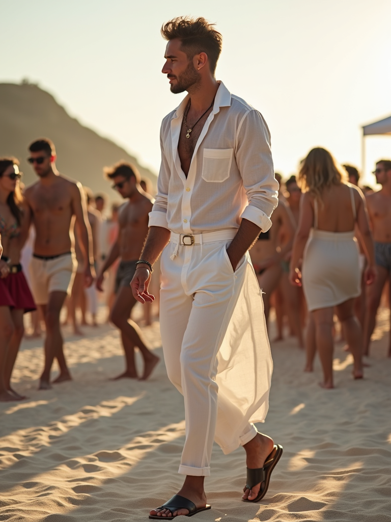 model at an exclusive beach party, wearing white linen ensemble with leather sandals, DJ booth and dancing crowd visible