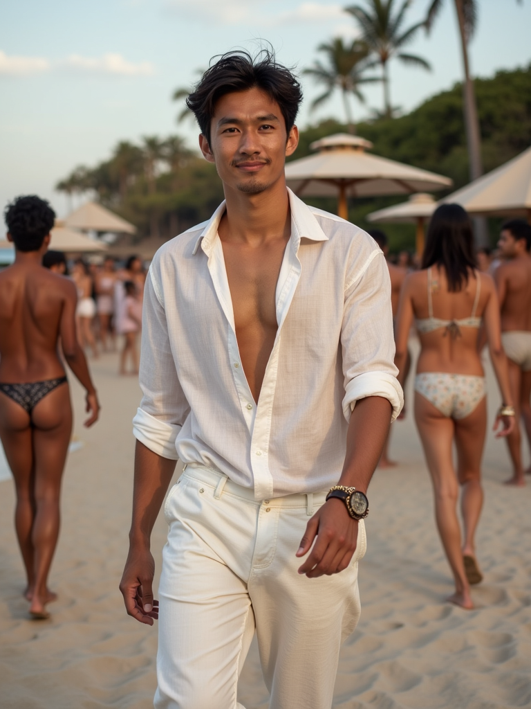 model at an exclusive beach party, wearing white linen ensemble with leather sandals, DJ booth and dancing crowd visible