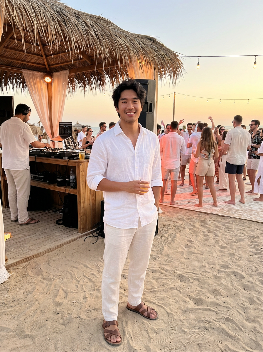 model at an exclusive beach party, wearing white linen ensemble with leather sandals, DJ booth and dancing crowd visible