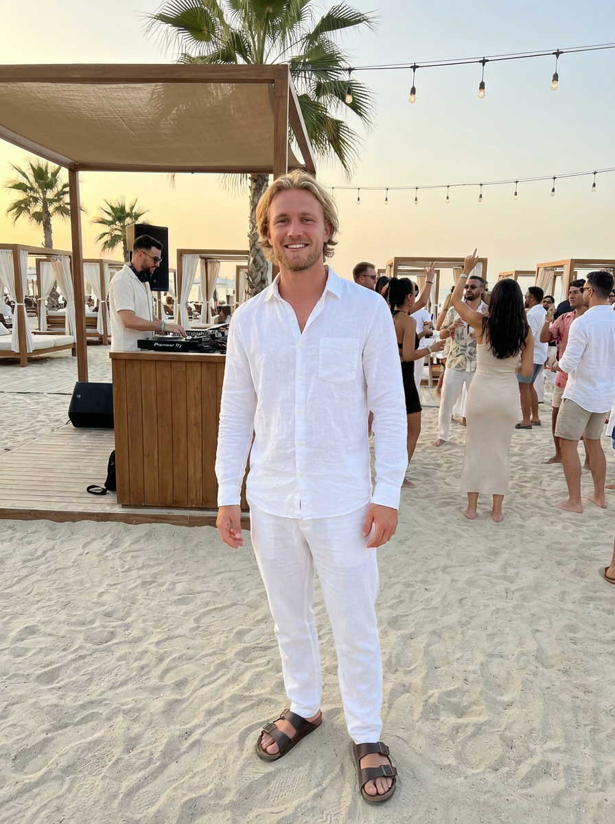 model at an exclusive beach party, wearing white linen ensemble with leather sandals, DJ booth and dancing crowd visible