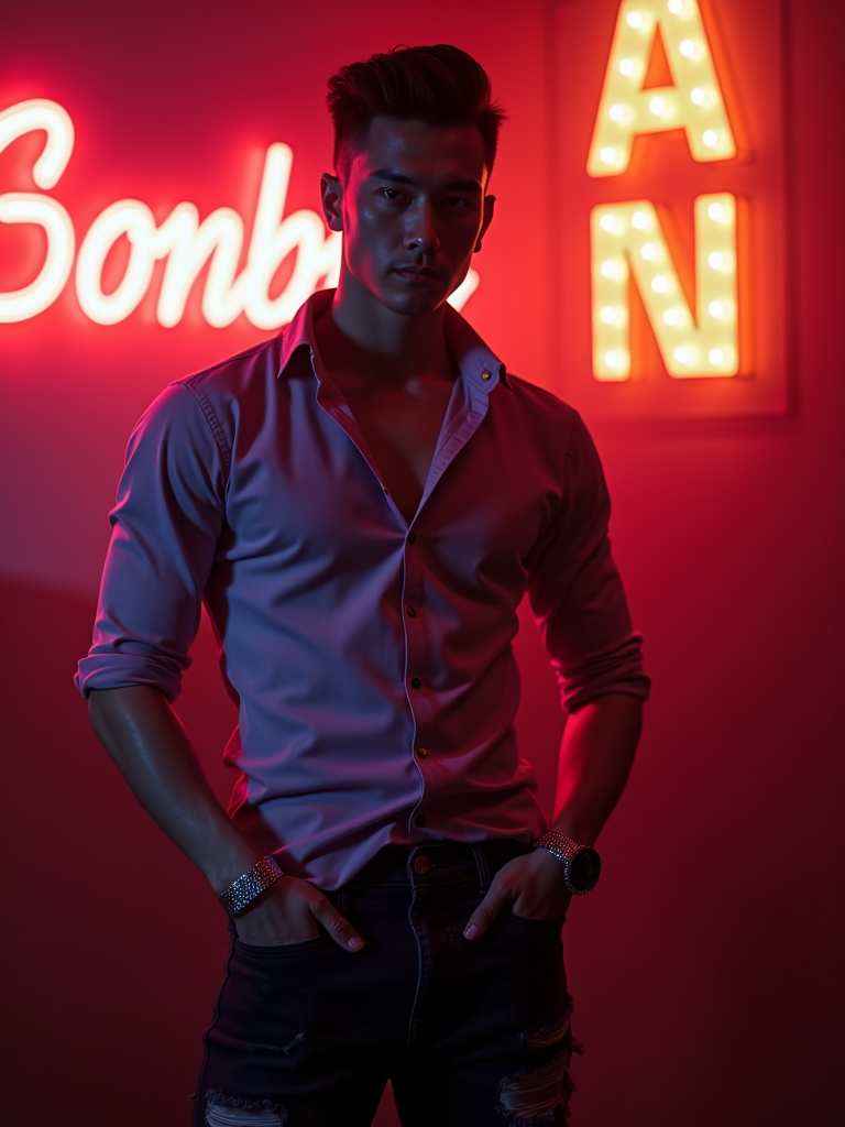model at an exotic dancer strip club in Las Vegas. at night. the model wears a bold and stylish outfit, like a fitted button-up shirt and dark jeans, with a confident stance.