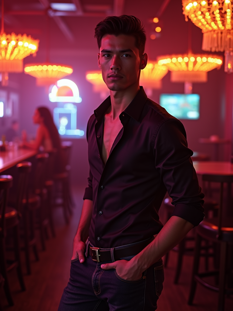 model at an exotic dancer strip club in Las Vegas. at night. the model wears a bold and stylish outfit, like a fitted button-up shirt and dark jeans, with a confident stance.
