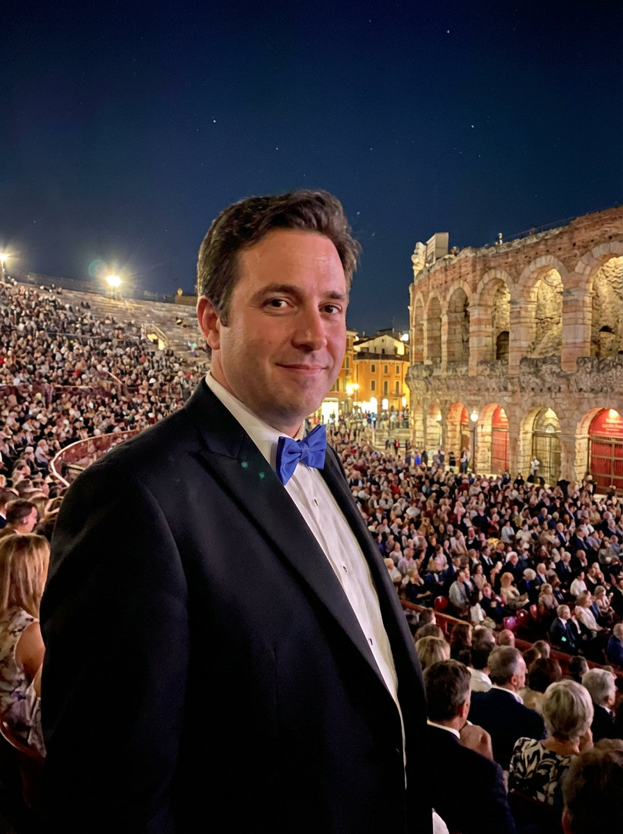 model at an outdoor opera in Verona's ancient Roman arena, wearing a classic tuxedo with European blue bow tie, under a starry Mediterranean night sky, surrounded by historic architecture illuminated by warm lights