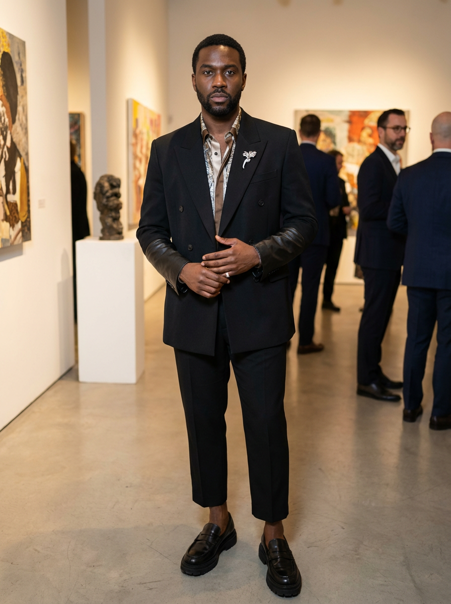 model at art gallery opening, sophisticated creative vibe, fashionable unique outfit