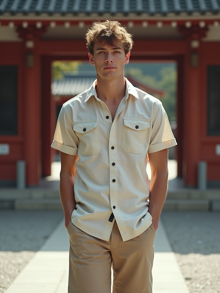 model at Asakusa temple, wearing khaki shorts with a linen button-up, traditional architecture visible