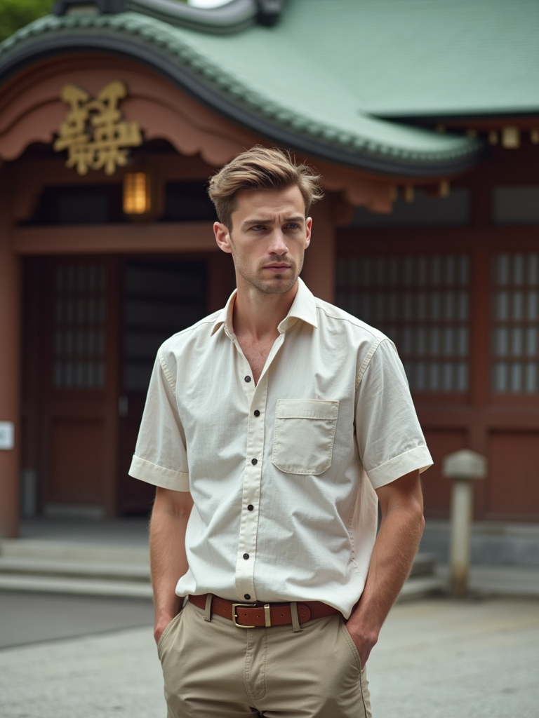 model at Asakusa temple, wearing khaki shorts with a linen button-up, traditional architecture visible