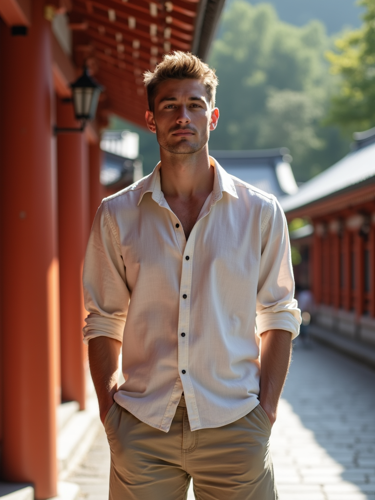 model at Asakusa temple, wearing khaki shorts with a linen button-up, traditional architecture visible