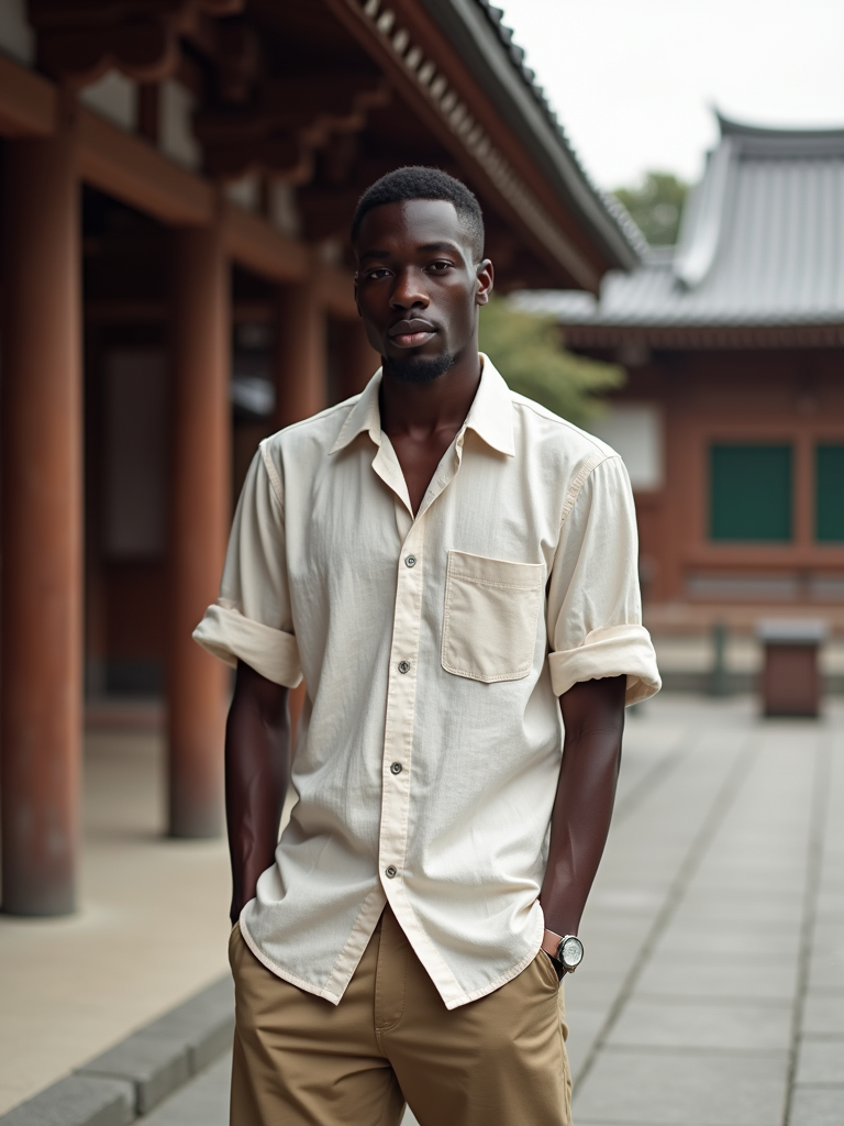 model at Asakusa temple, wearing khaki shorts with a linen button-up, traditional architecture visible