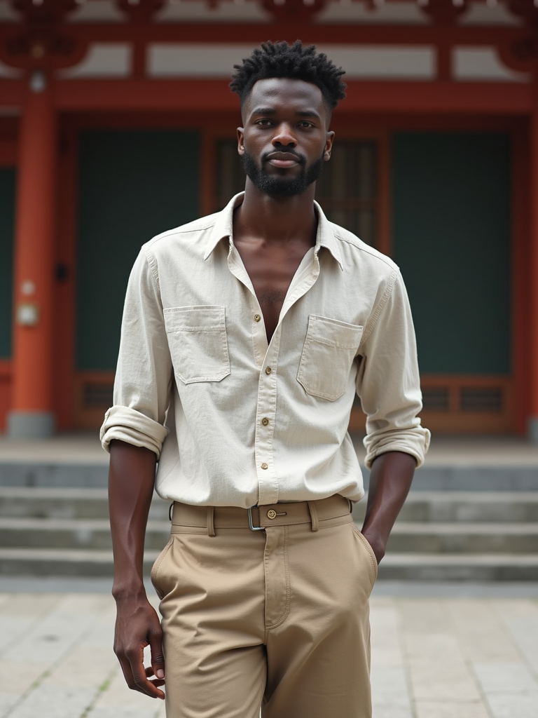 model at Asakusa temple, wearing khaki shorts with a linen button-up, traditional architecture visible