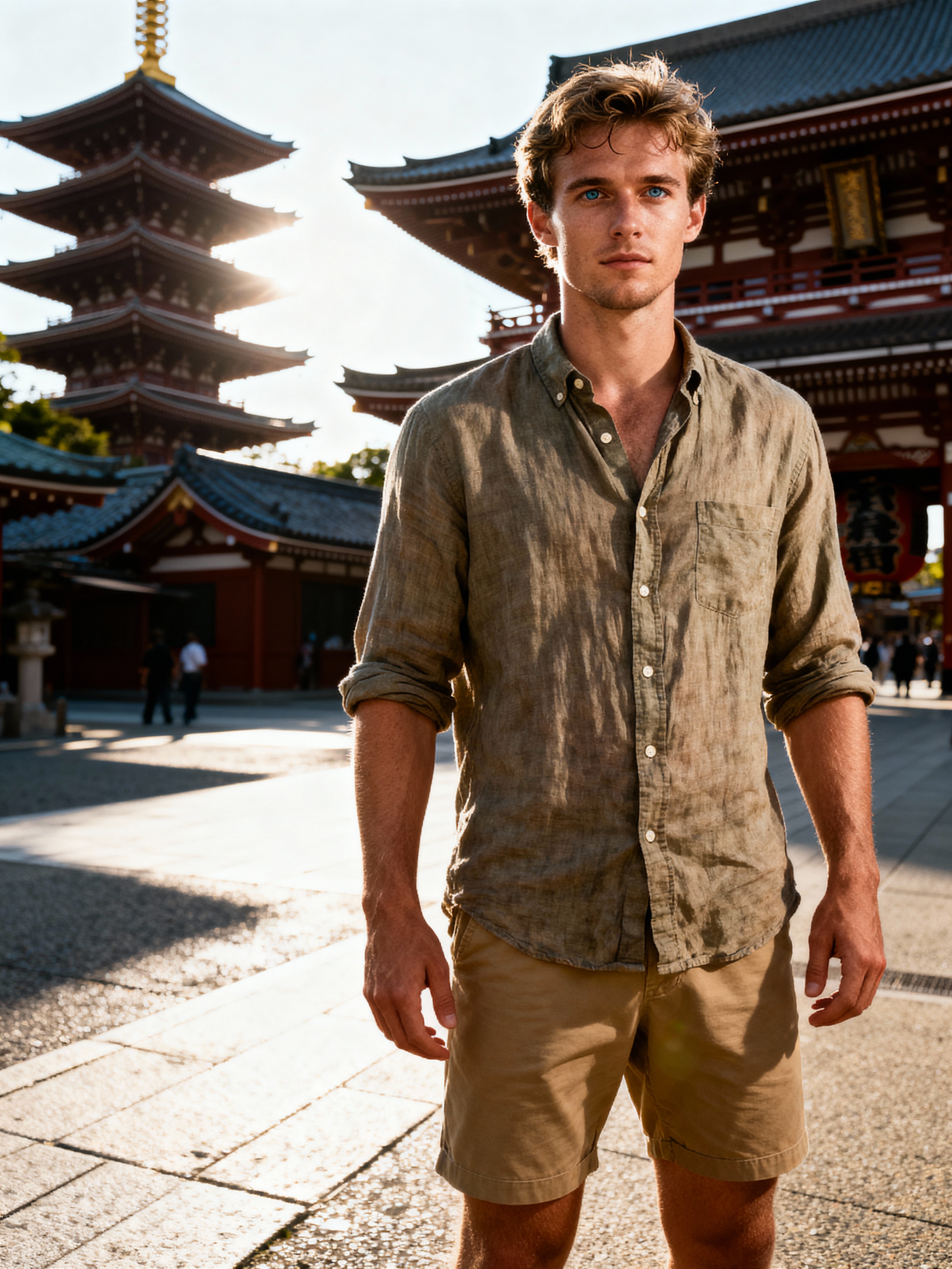 model at Asakusa temple, wearing khaki shorts with a linen button-up, traditional architecture visible