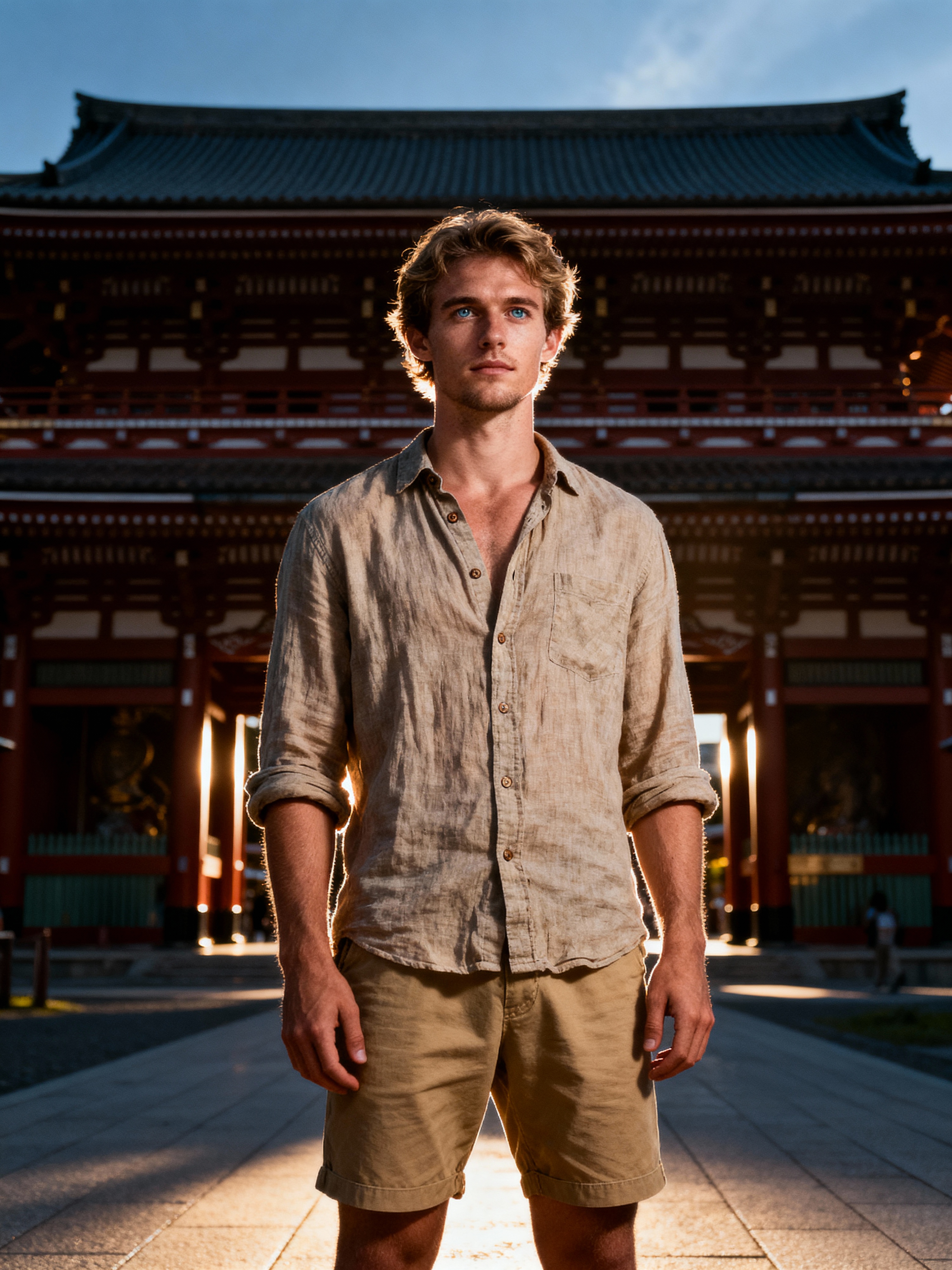 model at Asakusa temple, wearing khaki shorts with a linen button-up, traditional architecture visible