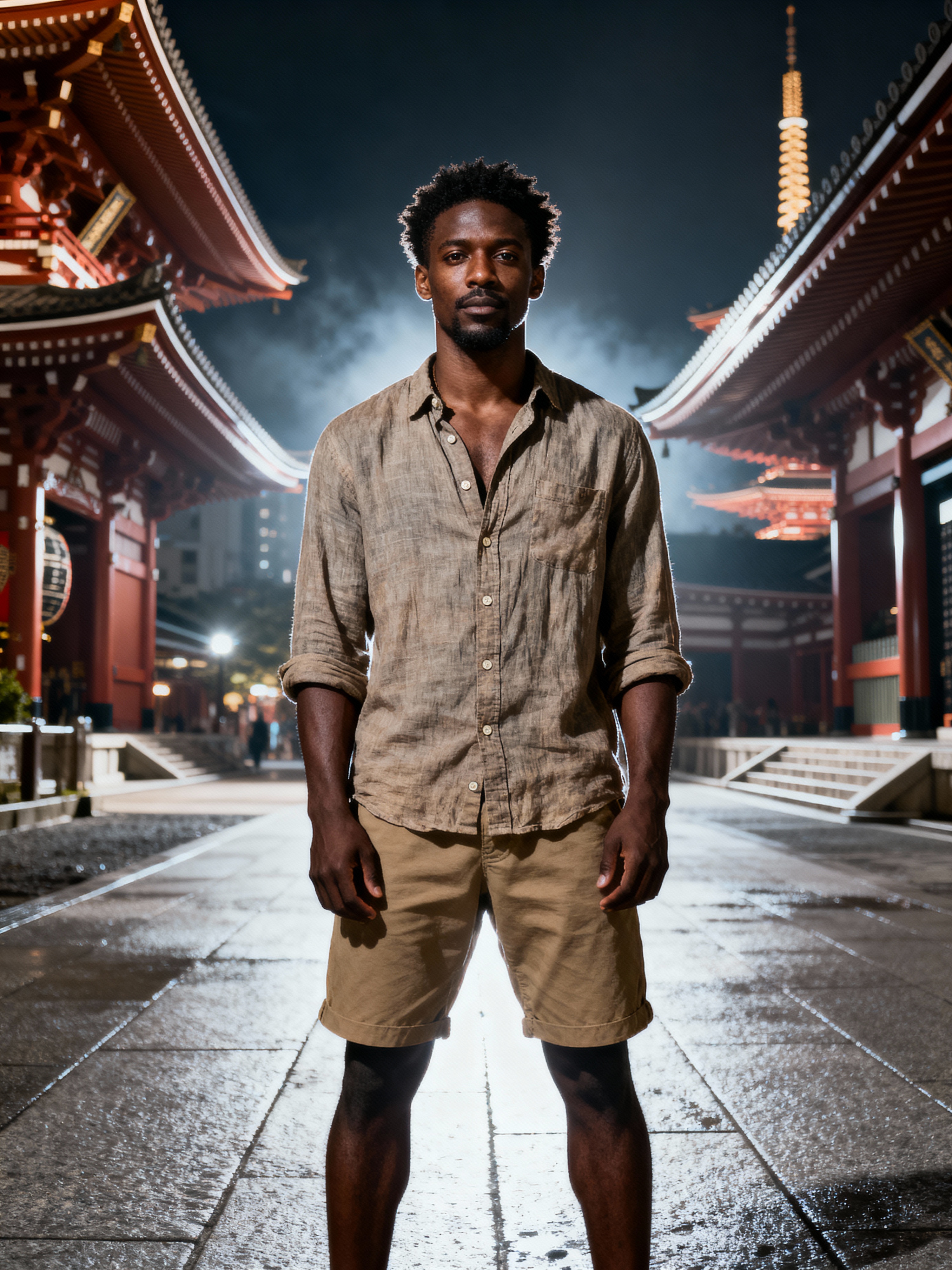 model at Asakusa temple, wearing khaki shorts with a linen button-up, traditional architecture visible
