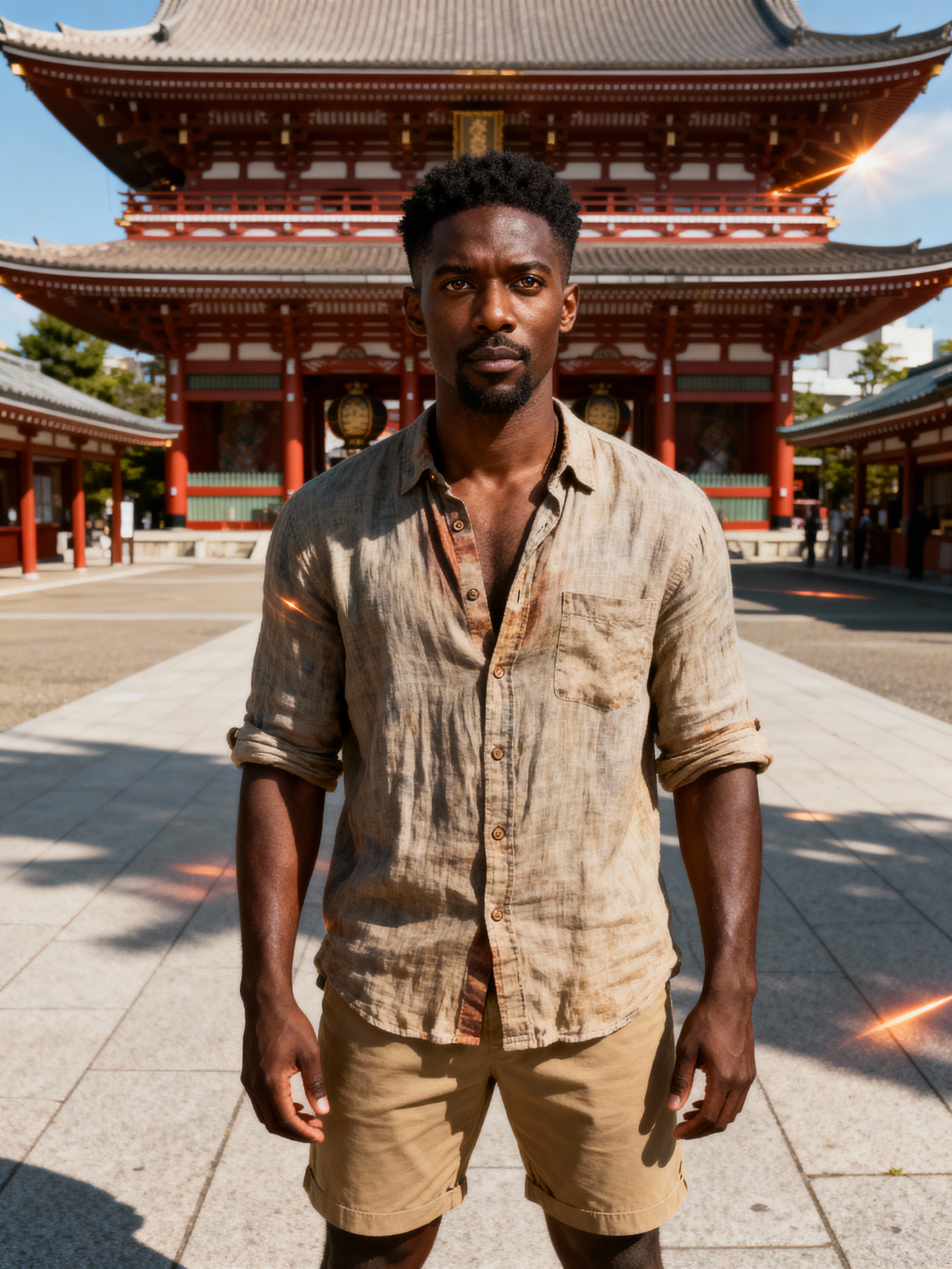 model at Asakusa temple, wearing khaki shorts with a linen button-up, traditional architecture visible