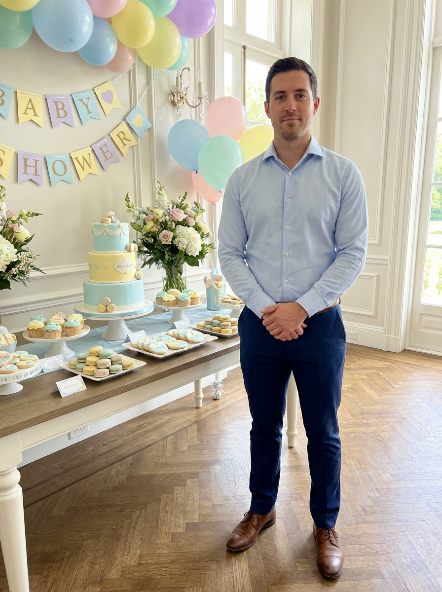 model at baby shower dessert table, beautiful cake and treats, pastel decorations, elegant celebration