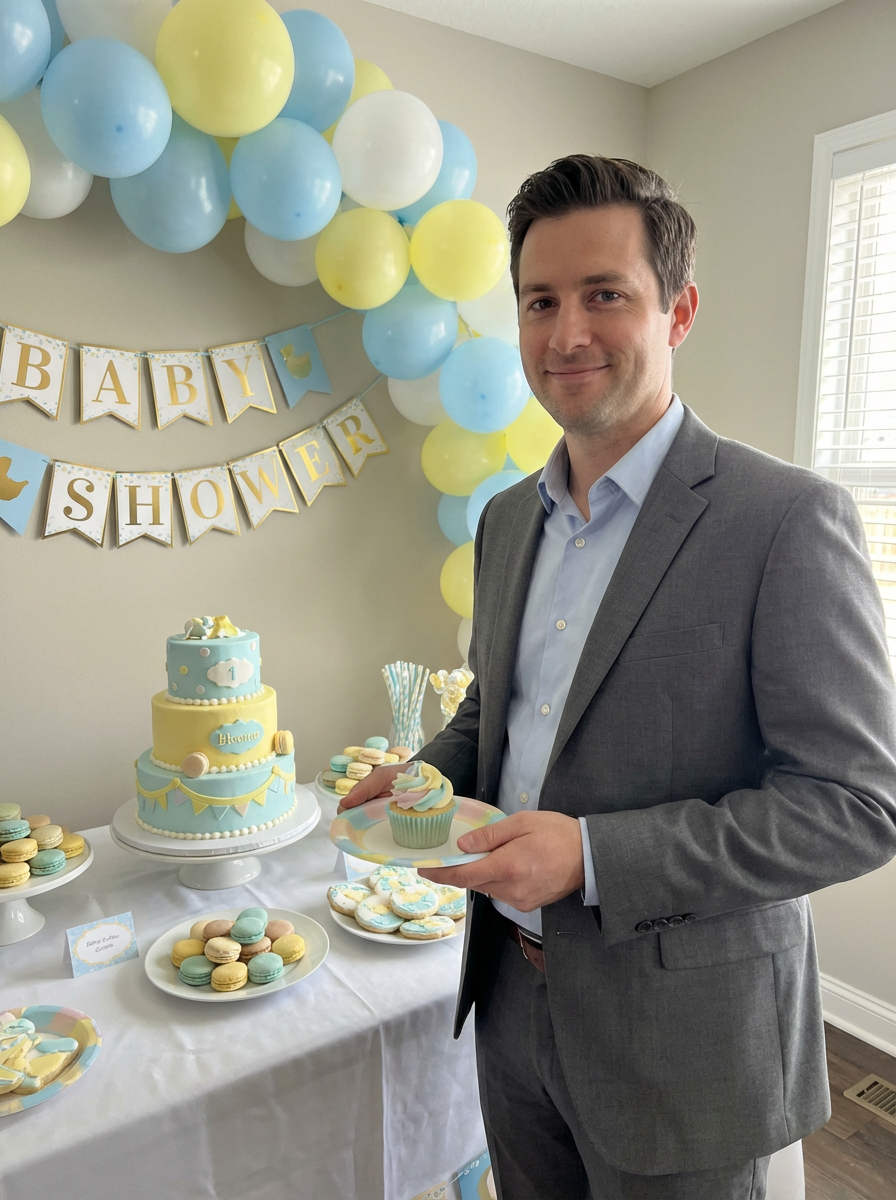 model at baby shower dessert table, beautiful cake and treats, pastel decorations, elegant celebration