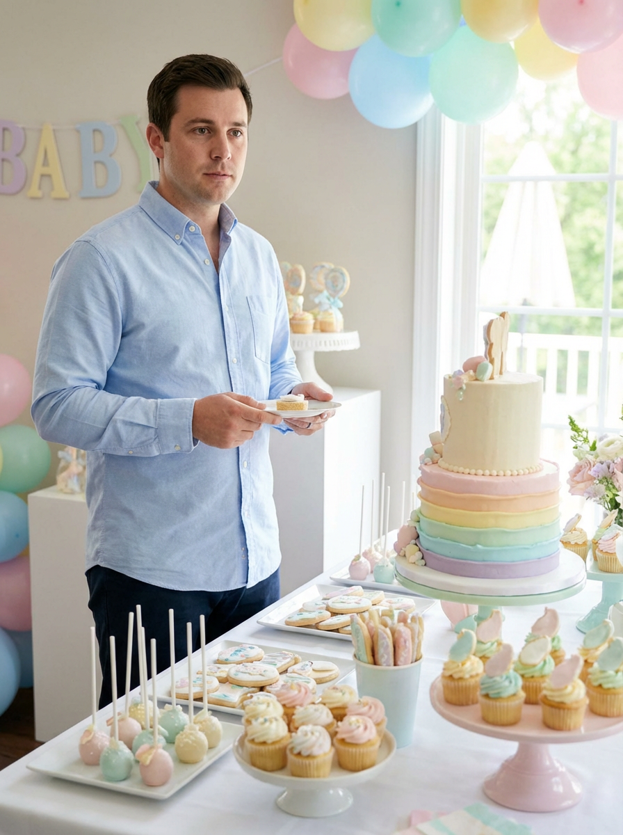 model at baby shower dessert table, beautiful cake and treats, pastel decorations, elegant celebration