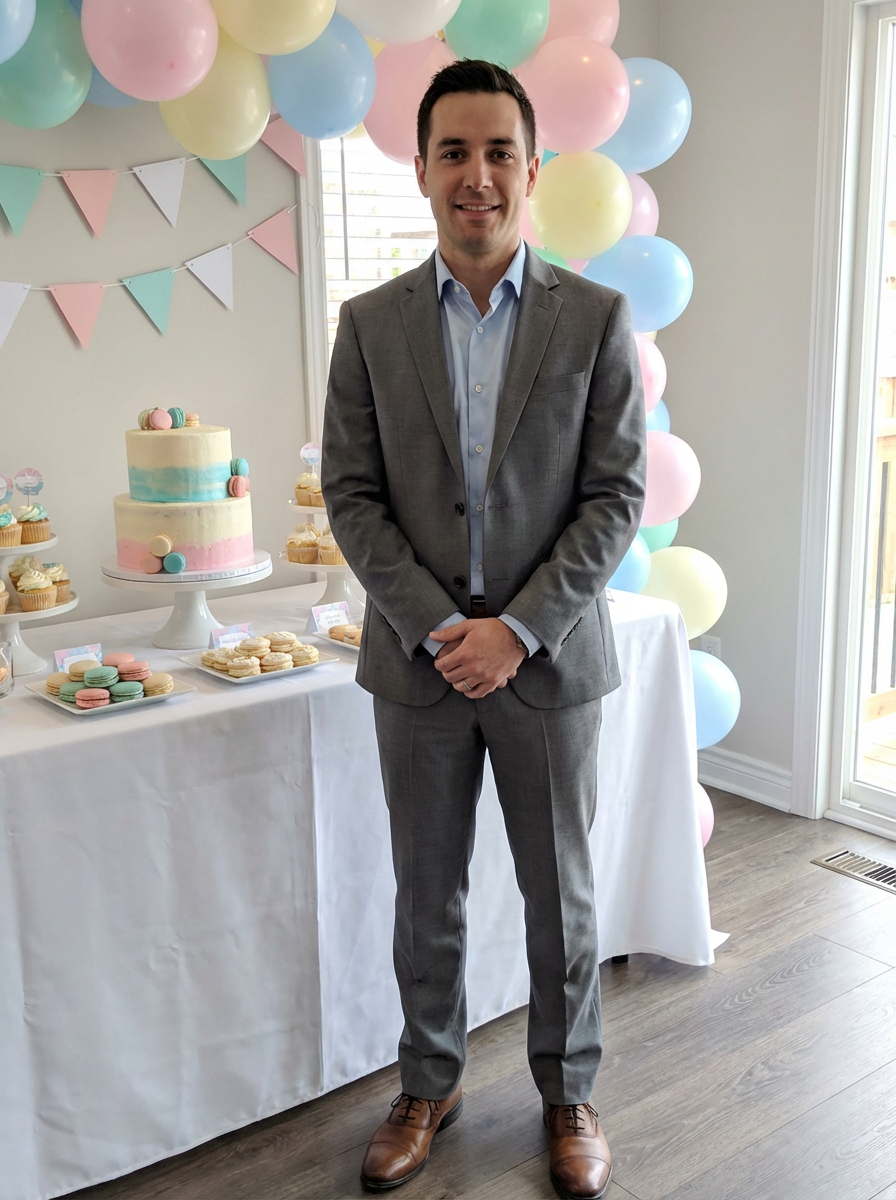 model at baby shower dessert table, beautiful cake and treats, pastel decorations, elegant celebration