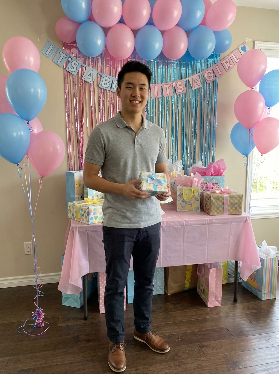 model at baby shower party, beautiful decorations in pink or blue, proud expecting parent, gift table visible