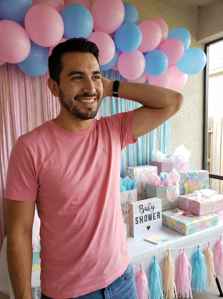 model at baby shower party, beautiful decorations in pink or blue, proud expecting parent, gift table visible