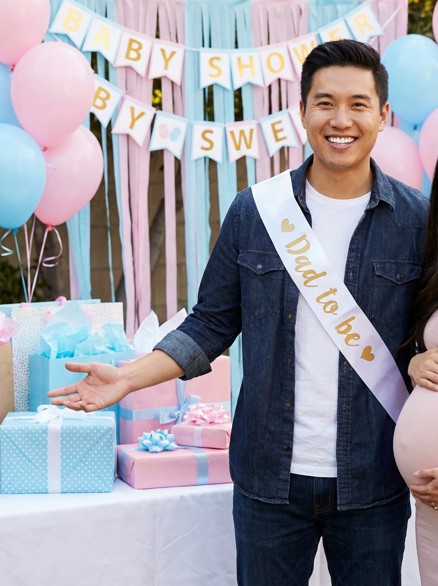 model at baby shower party, beautiful decorations in pink or blue, proud expecting parent, gift table visible