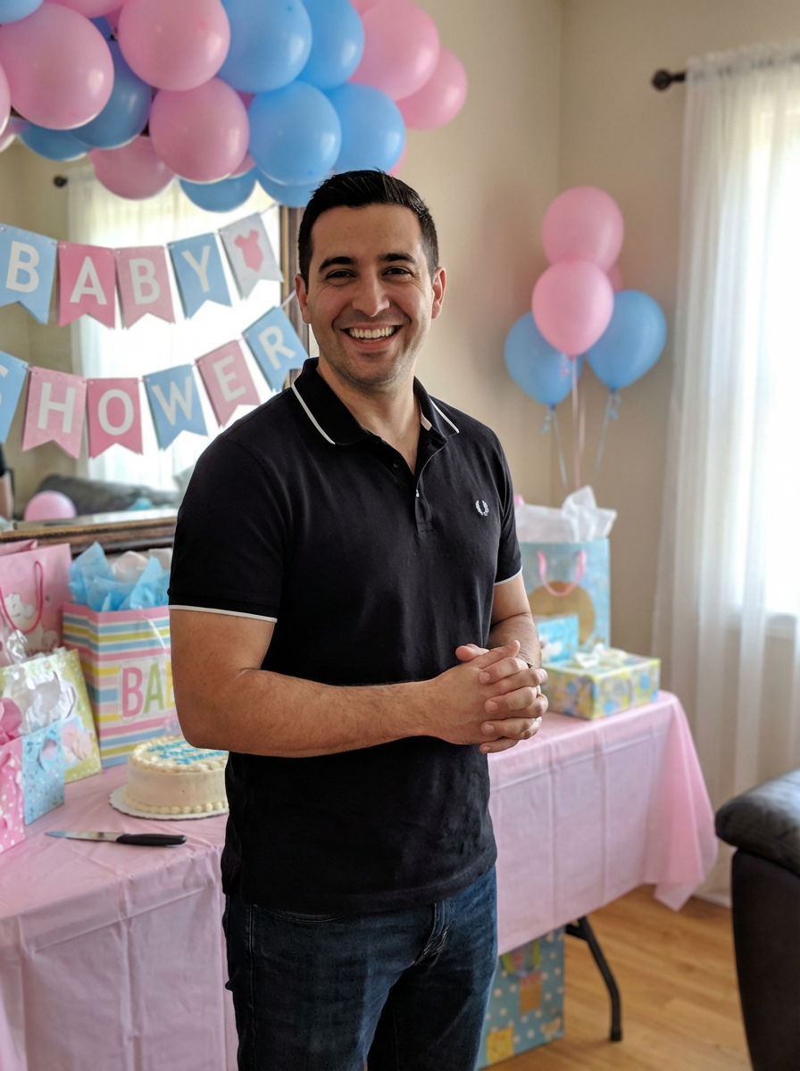 model at baby shower party, beautiful decorations in pink or blue, proud expecting parent, gift table visible