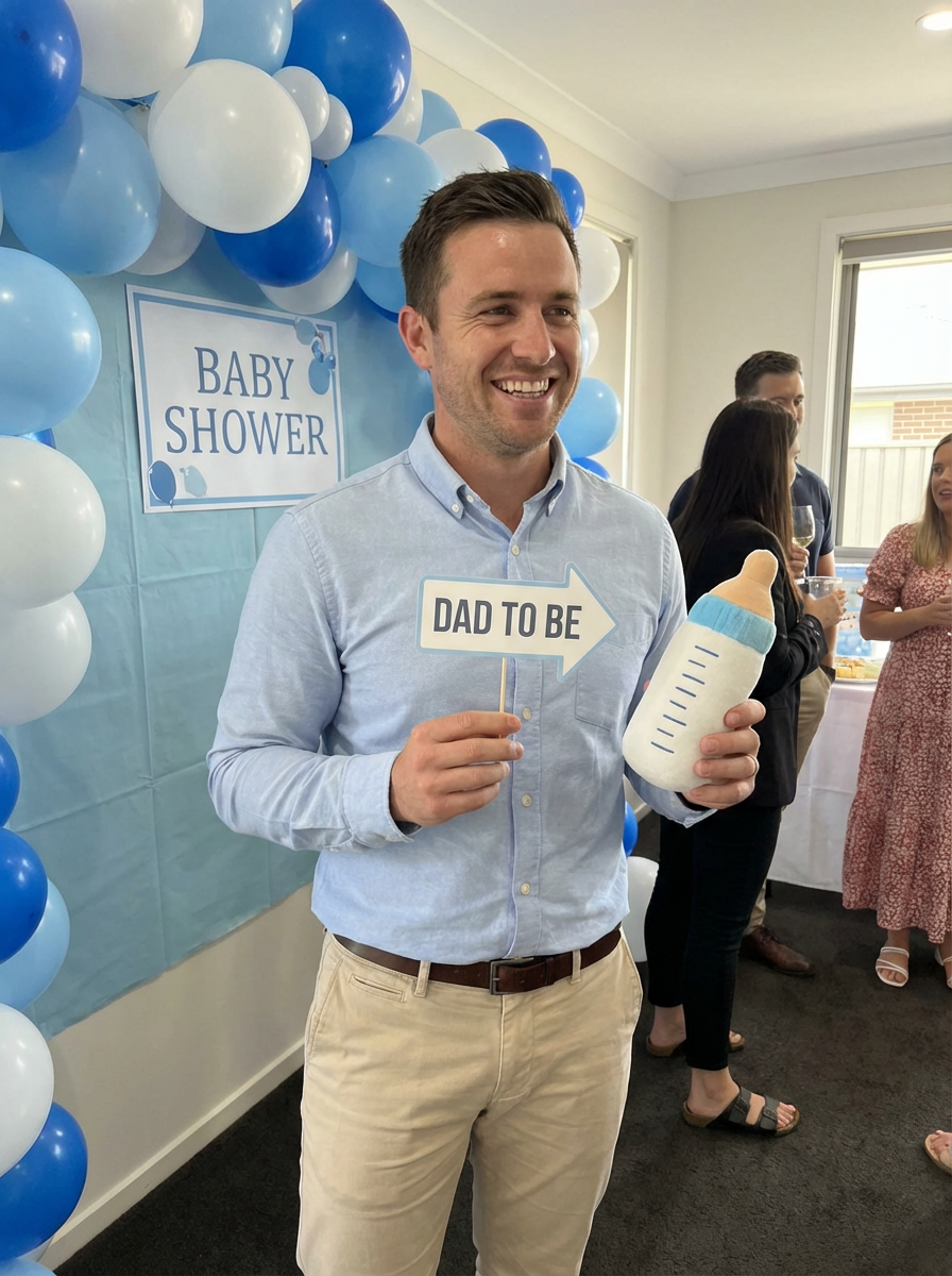 model at baby shower photo booth, cute props, expecting parent glow, fun memories