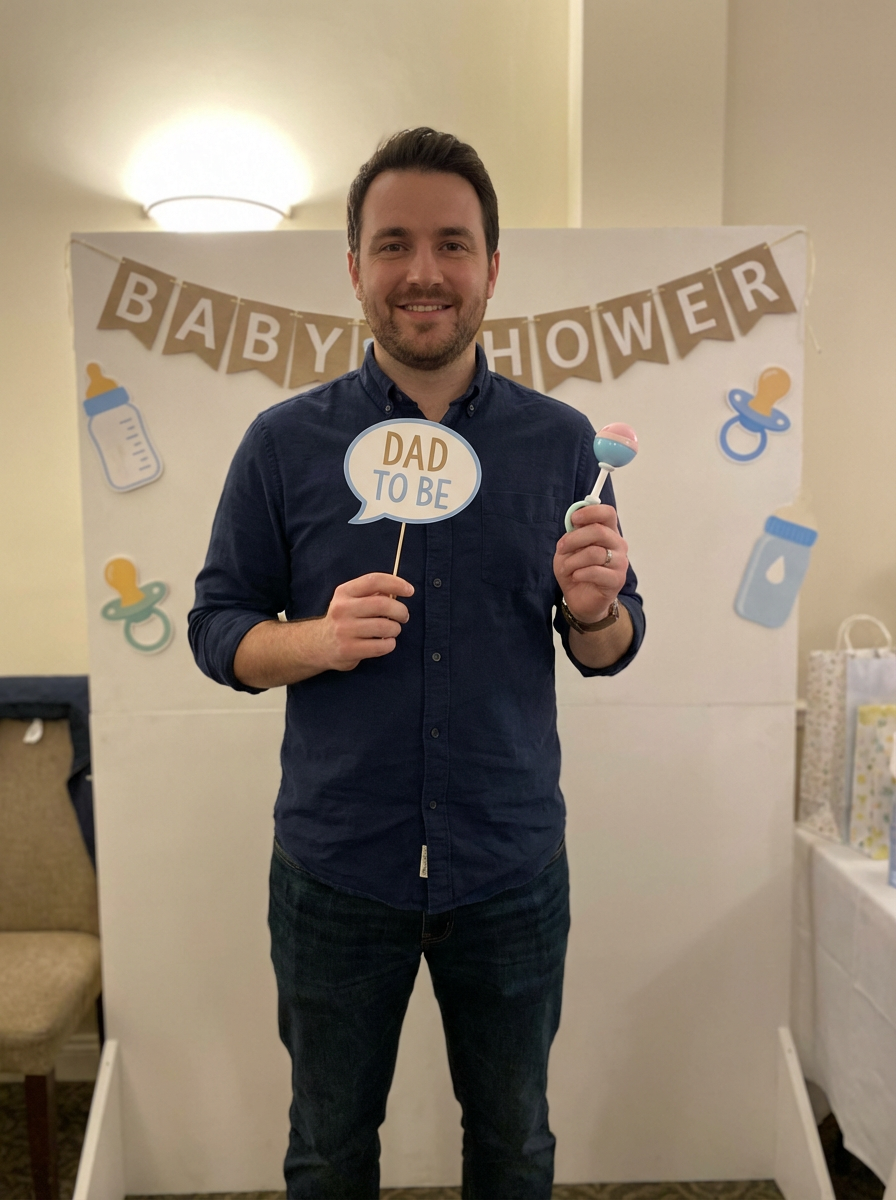 model at baby shower photo booth, cute props, expecting parent glow, fun memories