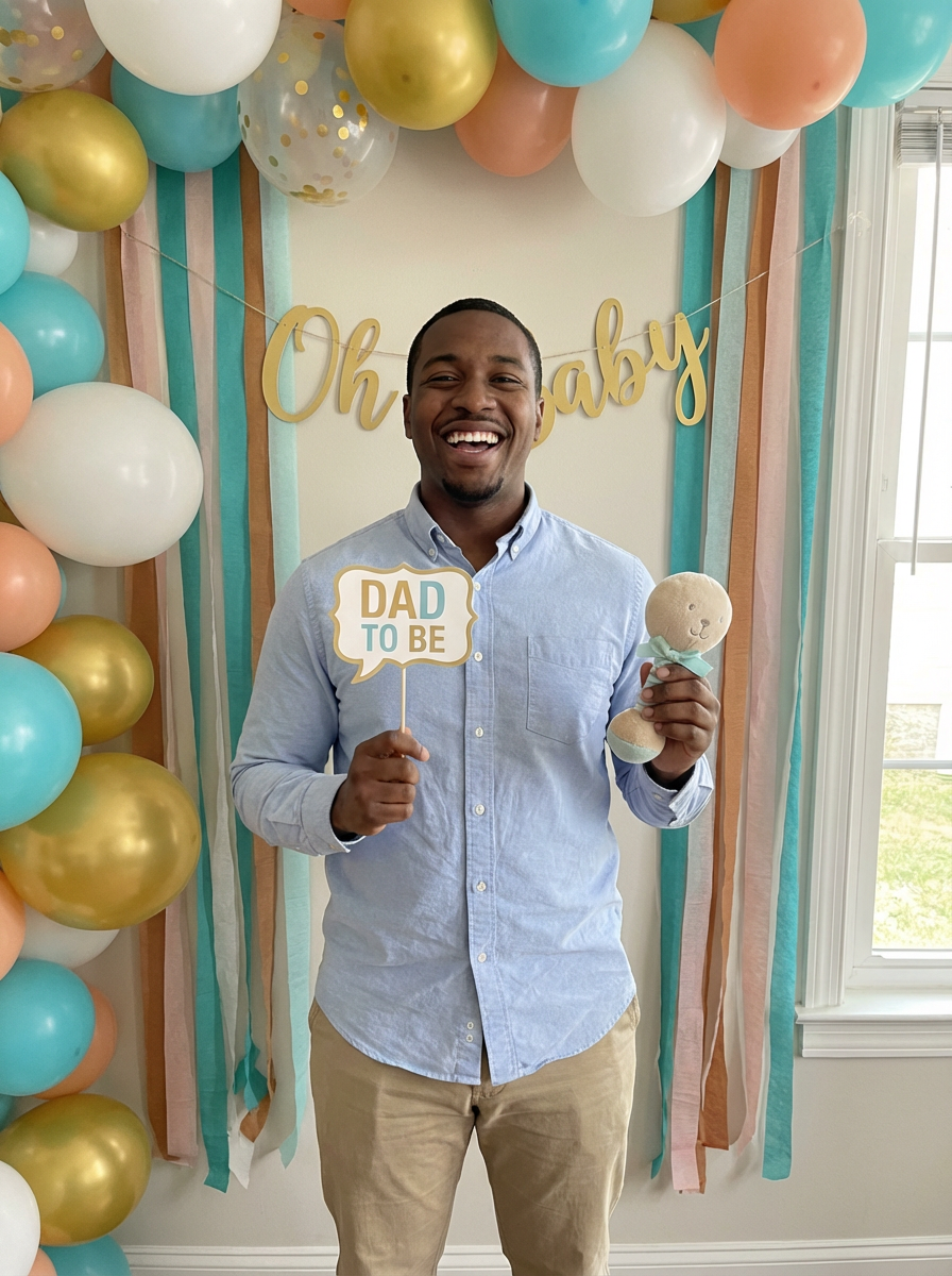 model at baby shower photo booth, cute props, expecting parent glow, fun memories