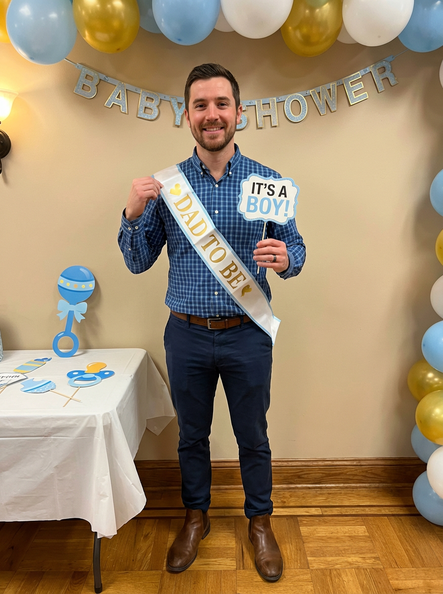model at baby shower photo booth, cute props, expecting parent glow, fun memories