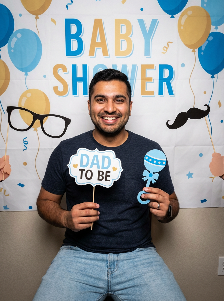 model at baby shower photo booth, cute props, expecting parent glow, fun memories