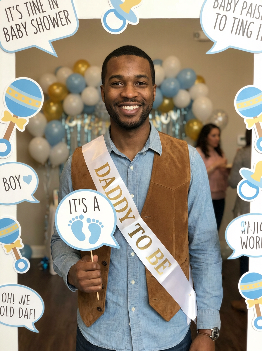 model at baby shower photo booth, cute props, expecting parent glow, fun memories