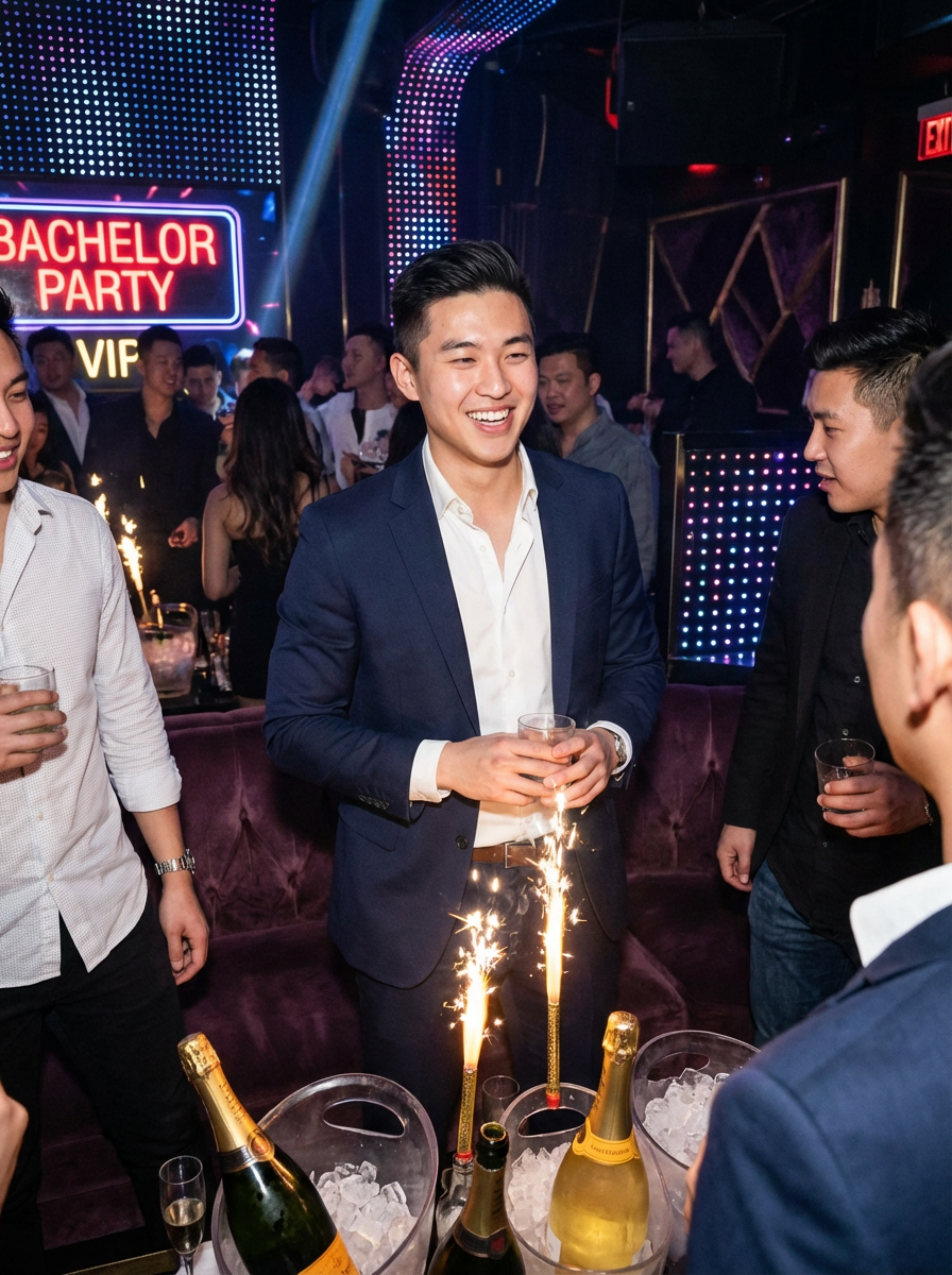 model at bachelor party club VIP section, bottle service, party atmosphere, sharp outfit, nightlife scene