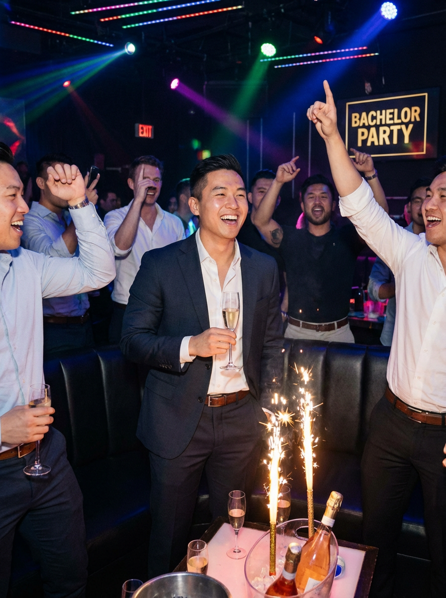model at bachelor party club VIP section, bottle service, party atmosphere, sharp outfit, nightlife scene