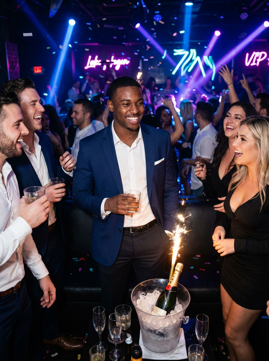 model at bachelor party club VIP section, bottle service, party atmosphere, sharp outfit, nightlife scene