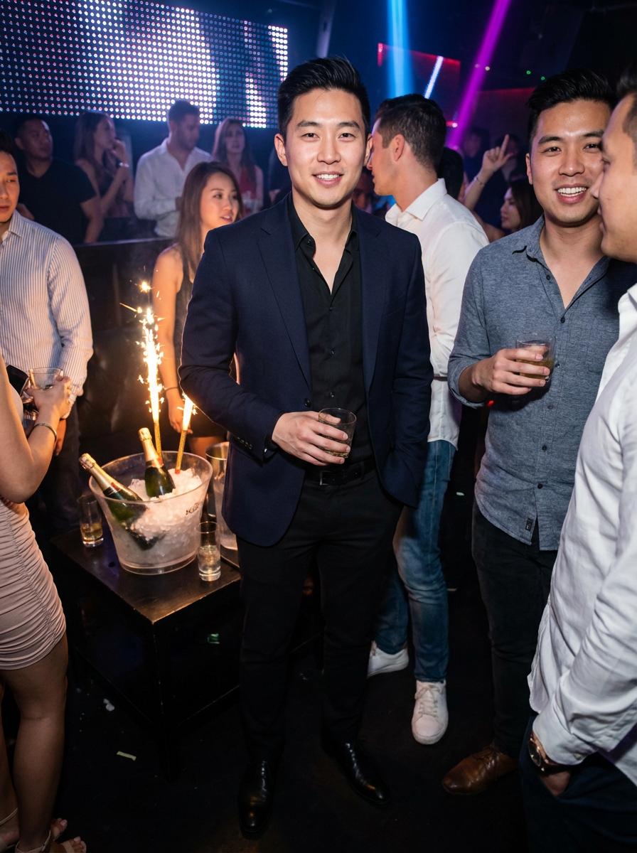 model at bachelor party club VIP section, bottle service, party atmosphere, sharp outfit, nightlife scene