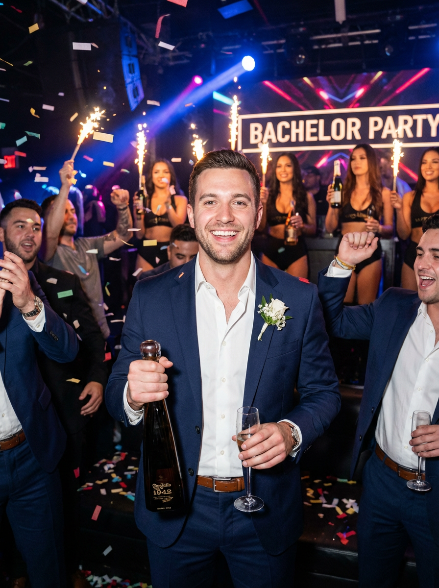 model at bachelor party club VIP section, bottle service, party atmosphere, sharp outfit, nightlife scene