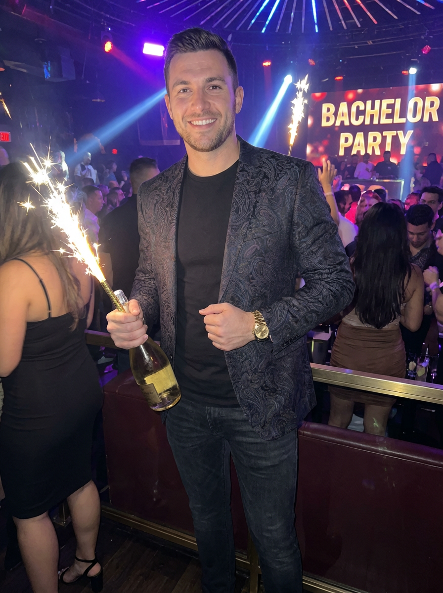 model at bachelor party club VIP section, bottle service, party atmosphere, sharp outfit, nightlife scene